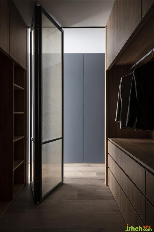 柜子的家裝效果設(shè)計(jì)分割為兩部分,上端封柜門(mén)作為被子及大物件收納,下端做開(kāi)架,方面掛衣服并加入移動(dòng)穿衣鏡功能。