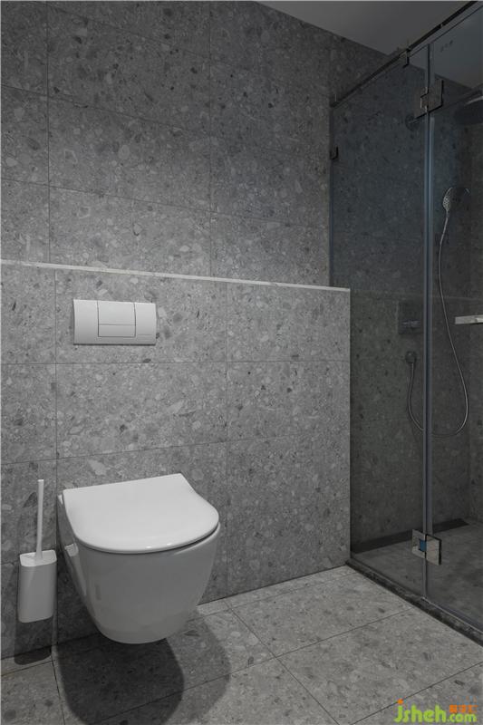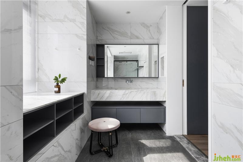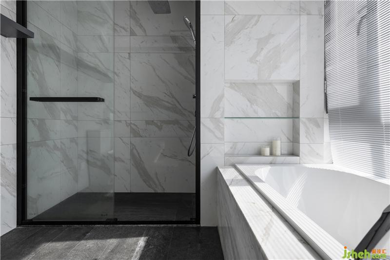 墻面爵士白石材律動(dòng)比例分割,給衛(wèi)浴空間增添活力。家裝效果設(shè)計(jì)采用白色百葉窗簾,營(yíng)造良好的光線氛圍。