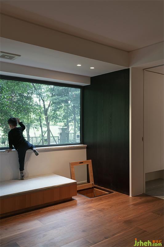 三代人的生活起居有所不同,因人而異構(gòu)筑獨(dú)立又共融的空間,讓個(gè)體得以安心放逐自我,同時(shí)擁有親密互動(dòng)的公區(qū)場(chǎng)域:茶室作為實(shí)現(xiàn)女主人茶藝和花藝的生活美學(xué)場(chǎng)所,又與孩子的兒童游戲間上下相連;男主人鐘愛(ài)地下安靜的科研辦公室,推門(mén)路過(guò)健身吧臺(tái)區(qū)又是一家人的其樂(lè)融融的影音室;阿婆可以在臥房生活陽(yáng)臺(tái)織一下午毛衣,也可推門(mén)在客廳照看兒孫,家人間互動(dòng)空間模糊又清晰,獨(dú)立又親密。