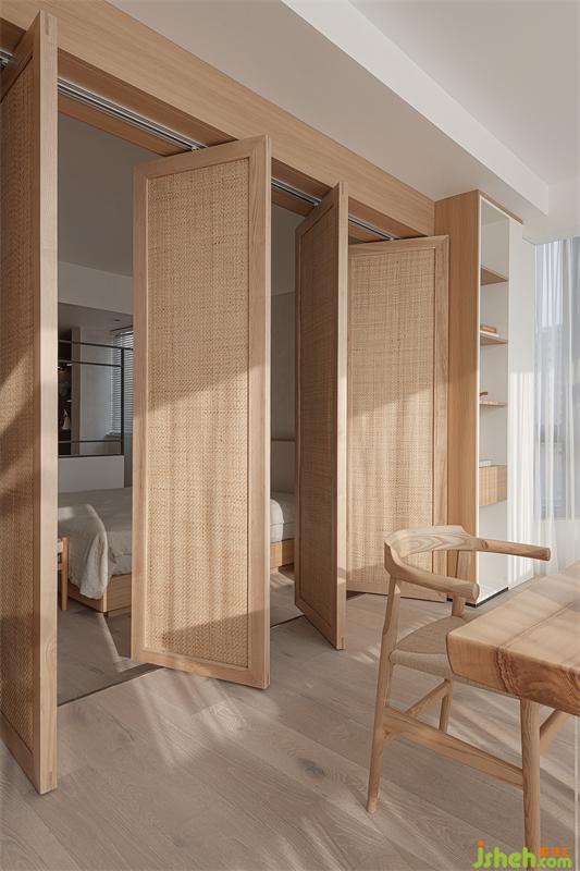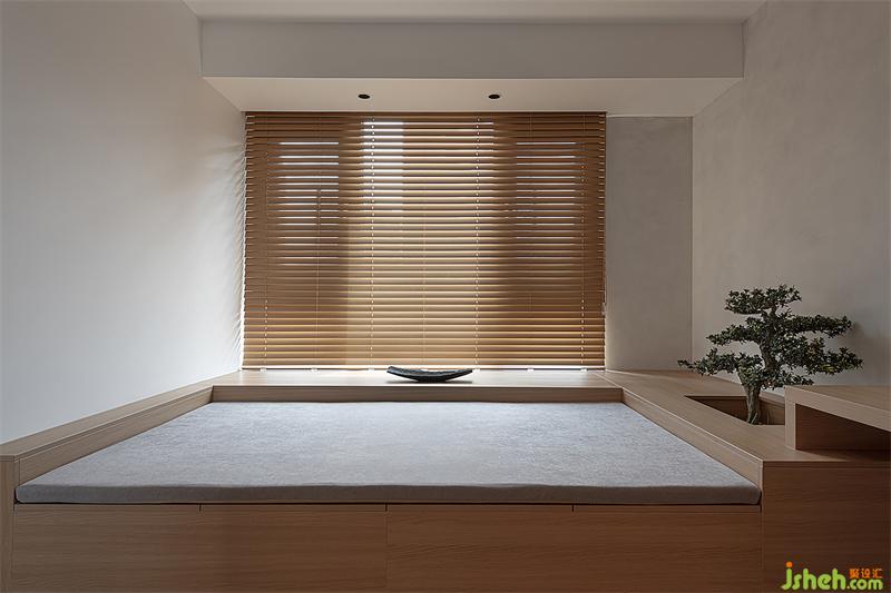 給喜靜的男業(yè)主一間獨(dú)立的書房用來(lái)辦公和冥想,簡(jiǎn)單到僅有:榻榻米、書桌、座椅,以及一片與書桌相連可以放書的木臺(tái),與其說(shuō)木百葉掌控著室內(nèi)的明暗,不如說(shuō)是他可以更游刃有余地與自我相處。