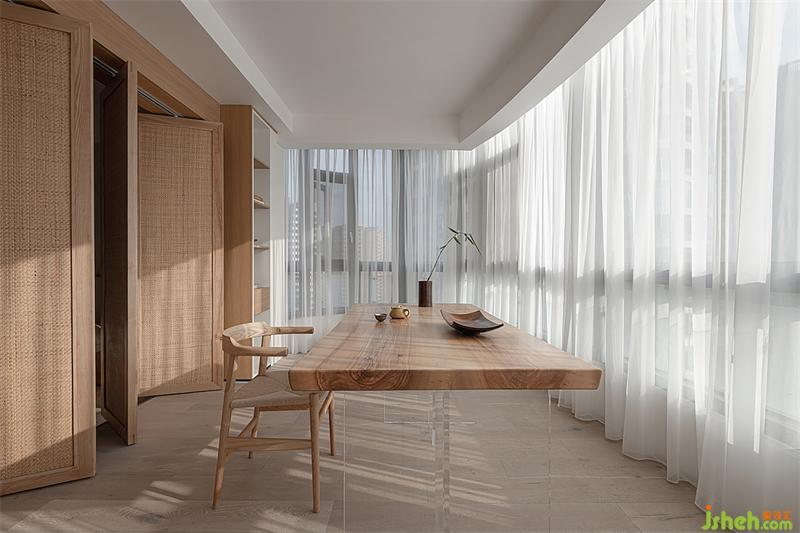 同時(shí)休閑陽(yáng)臺(tái)作為多功能區(qū)域又可以做女業(yè)主的茶室和書房,閑時(shí)插花、品茗、閱讀,一書一茶,讓居家生活充滿儀式感,為心情放松減壓。