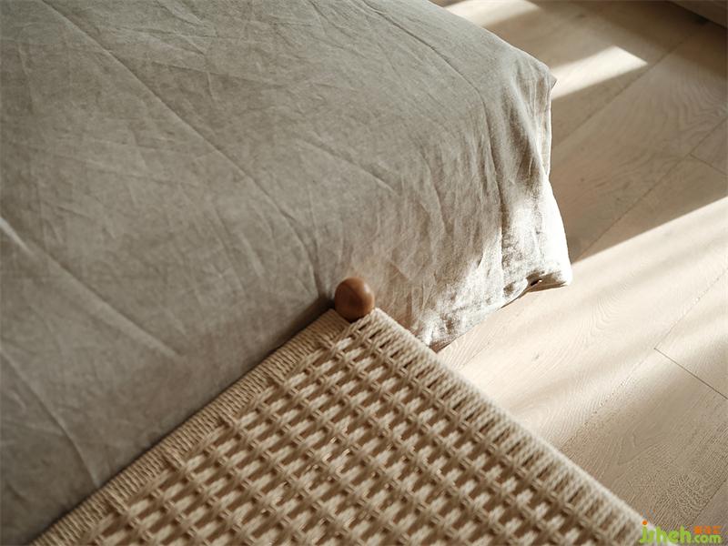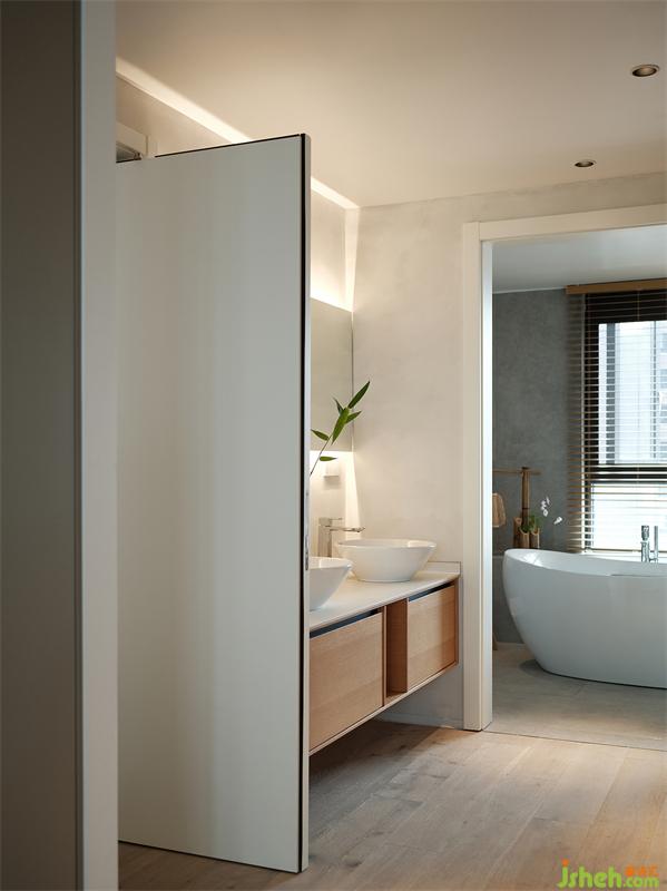 兩個(gè)衛(wèi)生間都扮演著中立的角色,主衛(wèi)以巖板鋪貼墻面,穿插原木質(zhì)感的架子與百葉窗,品質(zhì)與品味有了雙重的保障;飄窗臺(tái)上的木質(zhì)燈具為衛(wèi)浴空間增添了一絲活力。