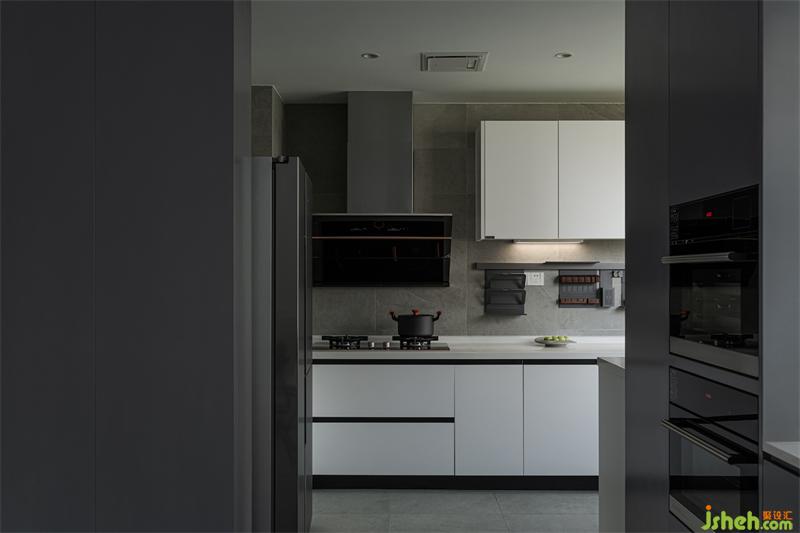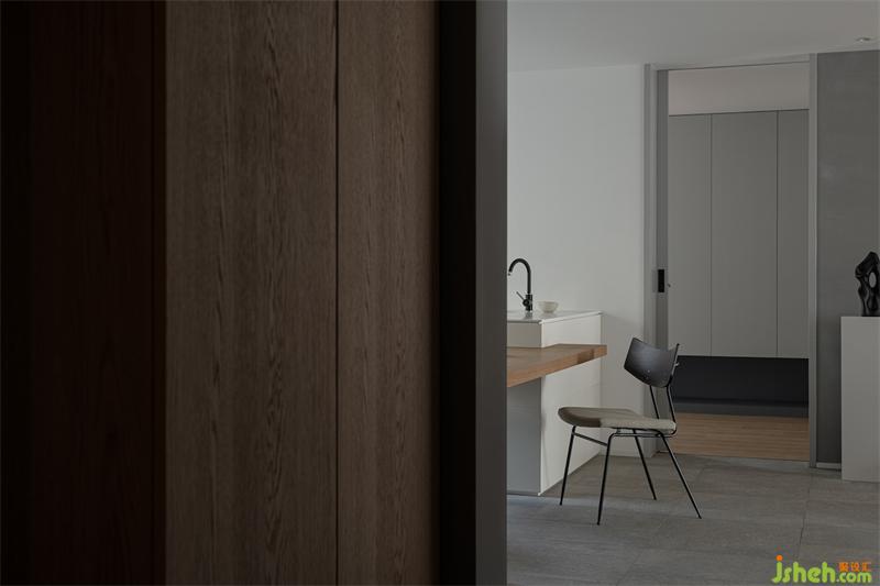 輕食區(qū)是定制的組合式島臺(tái),成都黑白灰設(shè)計(jì)采用白色與原木色搭配,在開放又包容的空間,讓居住者之間擁有更好的互動(dòng)體驗(yàn)。