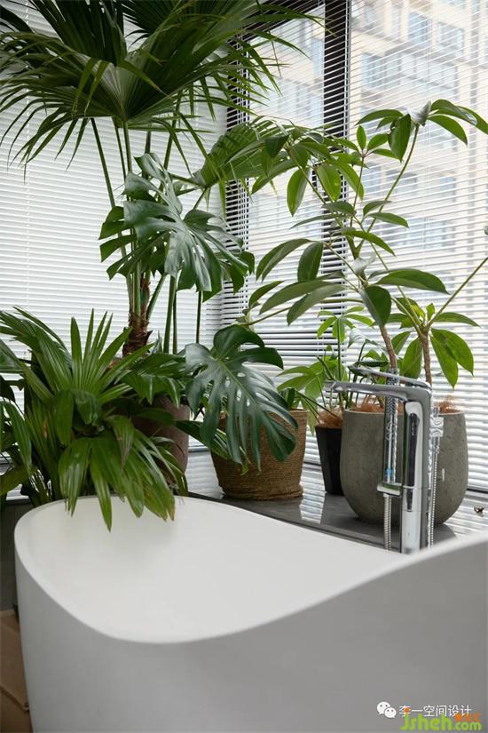 日升而起,日落而息,用橫軸劃分的左右分區(qū),將東面全部給了生活。盡最大尺度的飄窗臺給了主臥觀景的同時又保證了起居行為上的品質(zhì);進口床與床品建立了高品質(zhì)睡眠的裝修設(shè)計保障,充足的衣帽與收納給了一個干凈的家,溫暖的燈光緩亮,身躺森林系環(huán)境下的浴缸,這是一天完美的句號。
