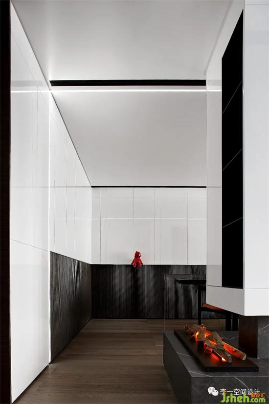 我們將南面的客房空間打造成可以書寫、辦公以及飲茶娛樂的交互空間,裝修設(shè)計(jì)通一套包圍的“7”字型元素對建筑原承重墻進(jìn)行視覺再創(chuàng),實(shí)現(xiàn)了客廳與休閑區(qū)的分離且交互,使得電視墻與交互區(qū)的收納得到實(shí)現(xiàn),也在無法更改開窗面積的情況下最大化實(shí)現(xiàn)自然光的室內(nèi)引入,同時有效的實(shí)現(xiàn)了公共區(qū)與休息區(qū)的分割。