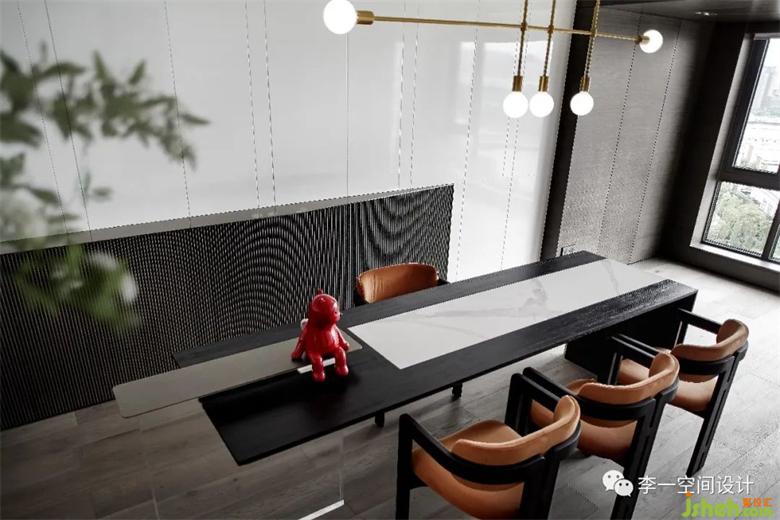 我們通過以“土”元素為基礎(chǔ)的巖板、“金”元素的銅件、“木”元素的橡木以及“水”元素的亞克力為創(chuàng)意源,裝修設(shè)計(jì)了互動空間中的家居產(chǎn)品——合桌,為這個空間增添了一份個性與唯一,一沏一注間人與人有了對話,主與賓之界有了模乎。張占占老師的藝術(shù)單品俏皮的敘說著這個空間的安靜,不多不少,一切剛剛好。