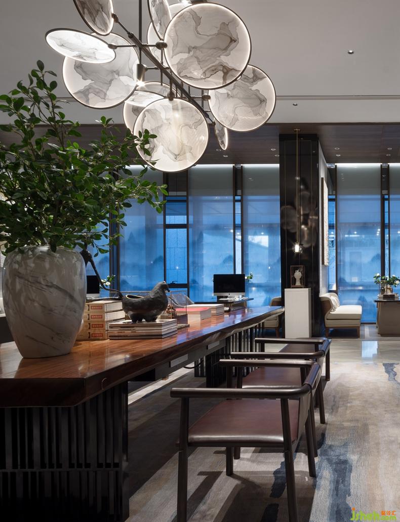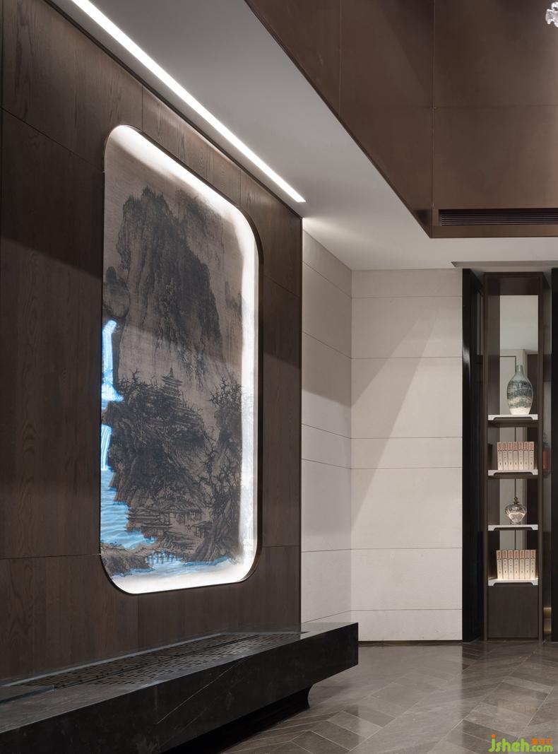 “欲把纖塵留歲月”、“入卷香魂化墨仙”,《溪山行旅圖》與刻Logo的硯臺形成影不離燈的關(guān)系。空間的感受并非單獨(dú)存在,深圳設(shè)計(jì)公司客人從參觀者演變成參與者,仿佛偶遇正在創(chuàng)作的范寬,進(jìn)入范寬作畫的場景。