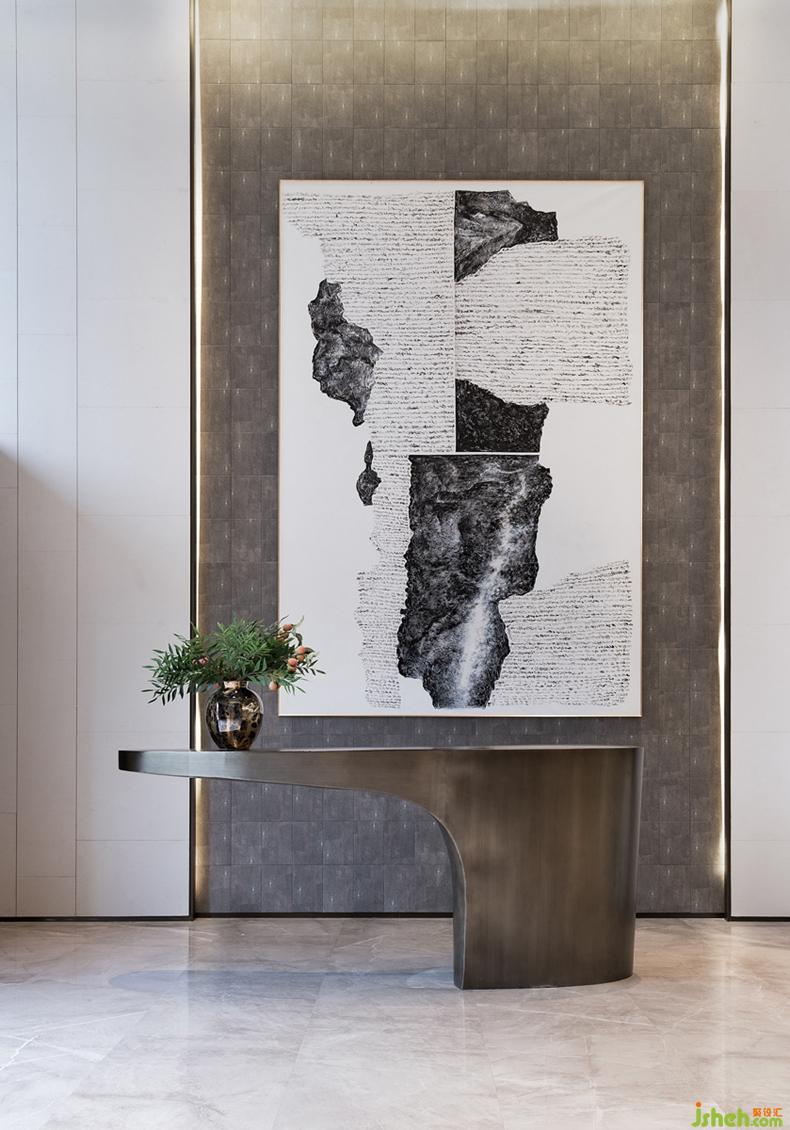 初進(jìn)悅府,抬眼望去,流暢筆直的直線,結(jié)合鋼拉網(wǎng)屏風(fēng)的通透打破原有空間的沉悶感,隱晦的勾勒出入口、沙盤區(qū)、洽談區(qū)的框架結(jié)構(gòu)。接待區(qū)的空間虛實(shí)的有層次,墻面上如蒲公英的鏤空設(shè)計(jì),設(shè)計(jì)公司從隱到顯、有張有馳,覆蓋于墻面之上泛出的細(xì)膩柔和光澤,把空間引人沉浸在一片閑情余緒之中,達(dá)到韻律、情感的統(tǒng)一。