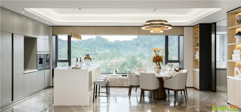 客餐廳設(shè)計(jì)擁有舒適的功能性,超大面寬的玻璃未使用一道分隔,將光線與戶外峰景納入眼簾,大方疏闊的格局,明亮的視野,感受與自然為鄰的愜意。別墅裝修設(shè)計(jì)
