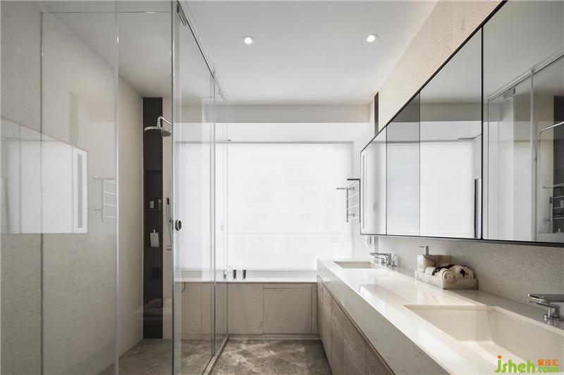 衛(wèi)浴間充分利用窗臺空間將浴缸嵌入磚體,與一體化的雙臺盆形成了明快洗練的視覺,智能墨鏡帶來未來家居之享。