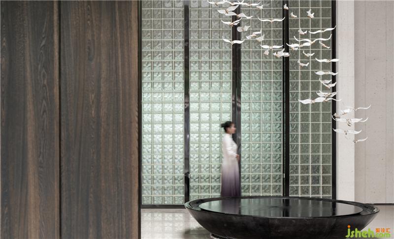 接待廳長(zhǎng)廊形的空間兩端點(diǎn)綴著帶有由福州漆器演變而來(lái)的裝置,在線條與光影的輝映中,迎接著八方來(lái)客。室內(nèi)設(shè)計(jì)師