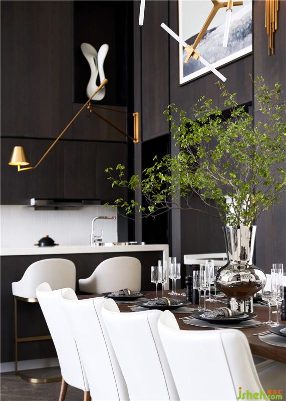 餐廳中,藝術(shù)的共鳴與回響在生活方式的映襯下得以彰顯,木藝餐桌搭配精致的器皿與花枝形燈飾,滿墻的攝影掛畫(huà)定格記憶力與想象力,陽(yáng)光的光暈罩在生機(jī)勃勃的花藝上,平衡黑白灰調(diào)的明度關(guān)系和冷暖關(guān)系,純粹而美好。