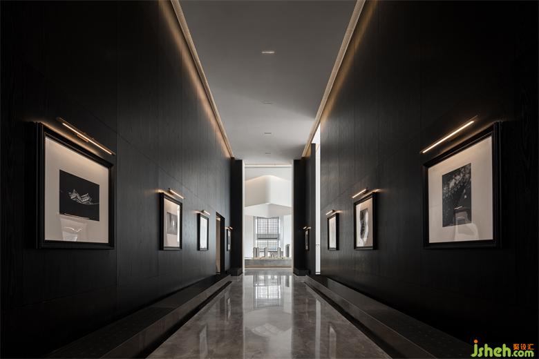 越過沙盤深入中庭,需經(jīng)過一段悠長的走廊。設(shè)計(jì)師有意在此降低明度,以深色的界面包裹空間,深邃、肅穆……心理感受產(chǎn)生變化。裝點(diǎn)于墻上的黑白古建筑攝影作,增強(qiáng)了室內(nèi)的藝術(shù)內(nèi)涵與氣息。人們在行進(jìn)的過程中可一覽太原古城的魅力與豐贍。
