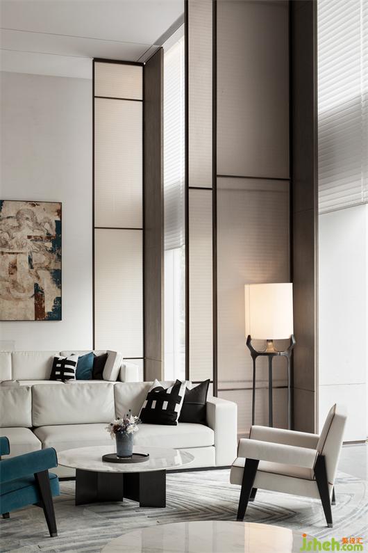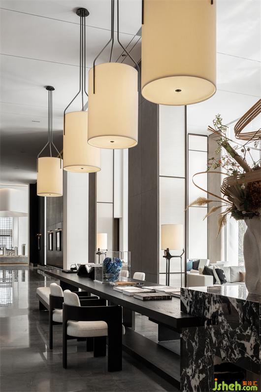 具有體量感的大型吊燈與冷兵器質(zhì)感的三足鼎立的落地?zé)簦瑸榭臻g增色,加強(qiáng)了空間的序列感和尊貴氣息。