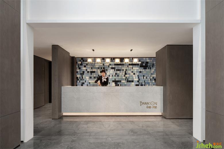 當(dāng)代藝術(shù)品更多地在追求造型的簡(jiǎn)化,轉(zhuǎn)而注重向內(nèi)的思考。由2800片陶瓷片構(gòu)成的水吧臺(tái)背景墻,吸取了琉璃的部分制作工藝,經(jīng)歷成型、素?zé)?、施釉、釉燒終成絢麗效果。