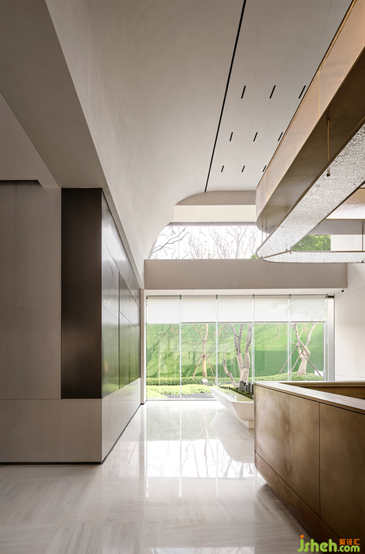 接待廳由兩側(cè)洞口引流,來(lái)到主空間,視野頓時(shí)變得通透開(kāi)闊。水吧區(qū)和沙盤(pán)區(qū)整合在一條軸線中,兩端為園林景觀,有良好的框景效果。