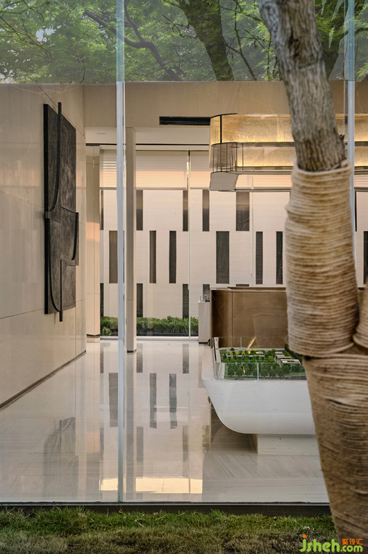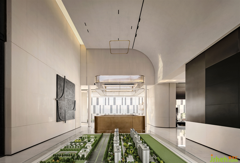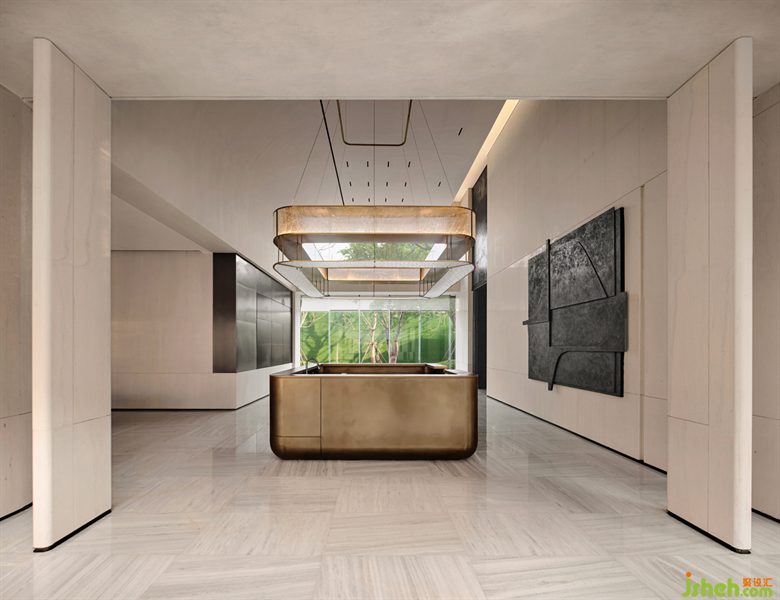 室內(nèi)整體采用了和外立面一樣的淺色溫潤石材,大量的留白界面,少量黑和灰的調(diào)和表達(dá)我們對煙雨江南的色彩印象。
