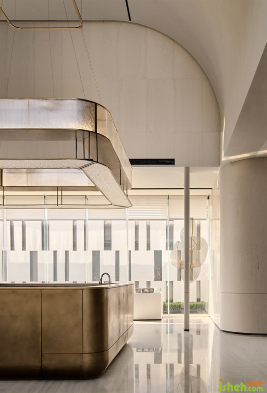 11月的南京,是金陵之色,金色是秋日的梧桐樹,是燦爛的陽光。營銷中心設(shè)計水吧以黃銅做舊材質(zhì)打造,色出秋意,其色郁黃,加以端正的體塊,予人顯貴大氣之感。