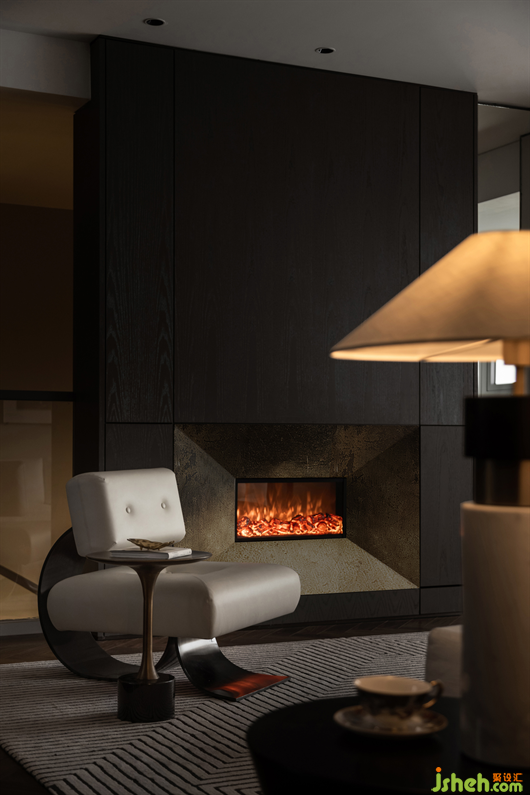 △木飾面營造的舒適愜意之外,拉絲古銅、皮革、大理石也很好地點(diǎn)綴出了一種海派的精致感;體塊鮮明的素色墻面兼顧了影視廳背景墻的功能,并以弧線切分嵌入一架壁爐,點(diǎn)染冬日的陣陣暖意。