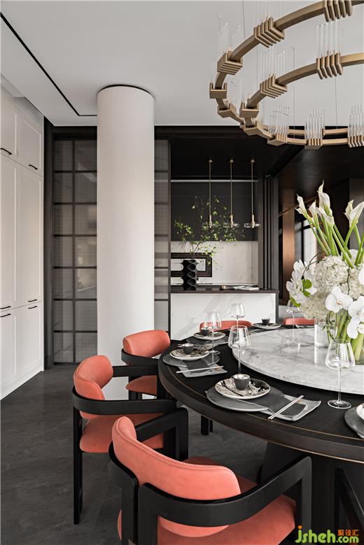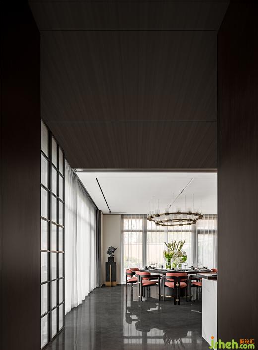 別墅設(shè)計大規(guī)格圓餐桌與吧臺滿足東方家庭的團圓與現(xiàn)代簡餐的自由,餐廳與庭院形成聯(lián)動,營造花園般宴會廳情境。