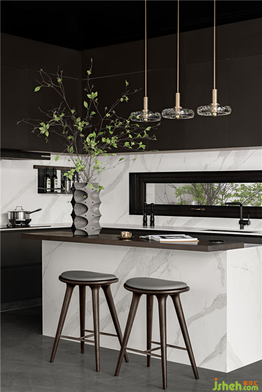 在容易受人忽視的廚房,別墅設(shè)計也不遺余力去提升使用品質(zhì)與空間質(zhì)量。備料區(qū)的立面巧妙地增加了一條水平條窗,里外可以視野相對,空氣流通,自由交流。廚房再也不是一個斷絕交流的封閉場所,或?qū)⒊蔀榧彝テ錁啡谌诘纳缃粓龅亍?