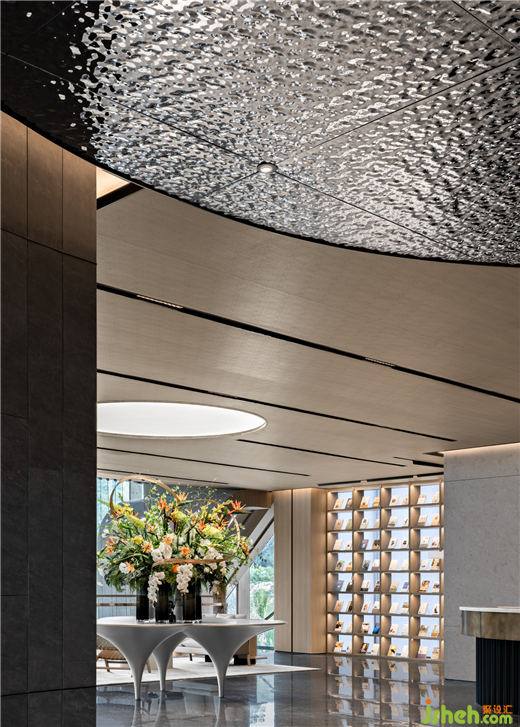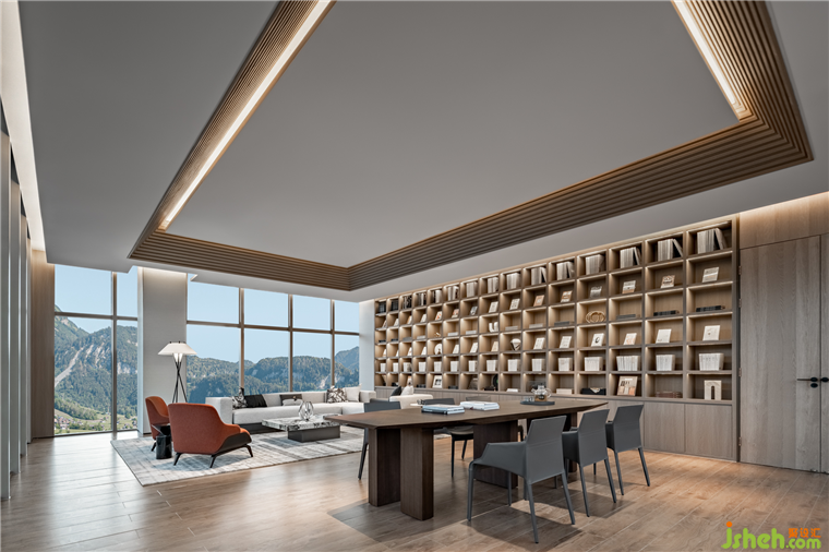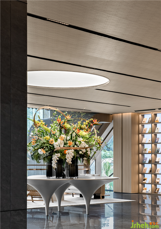 二層以挑空架構形成層高優(yōu)勢,巨幅的落地窗把室外的光與景納入室內,景色宜人。營銷中心設計大幅的展示架組成立面貫穿整個空間,開放性的大空間規(guī)??涉敲郎鐓^(qū)圖書館。