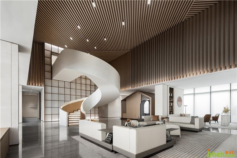 公共洽談區(qū)頂部造型設(shè)計(jì)靈感源于沈陽中國工業(yè)博物館的外立面,博物館建筑以鋼鐵等金屬材料塑造硬朗大氣的外觀,我們將建筑造型的特色提煉為室內(nèi)設(shè)計(jì)的語匯,營銷中心設(shè)計(jì)使用溫潤的木材朝不同角度有序列的順延,生成有強(qiáng)烈造型感的空間結(jié)構(gòu)。在視覺上更為簡約大方,且增強(qiáng)了與人的親近感。