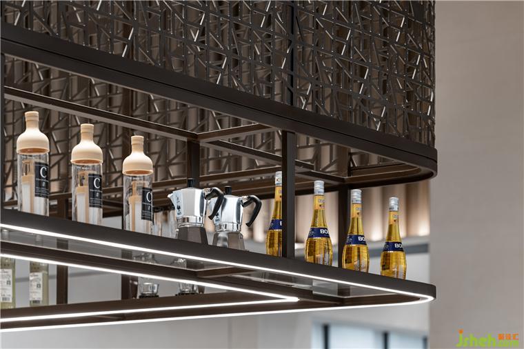 中間的水吧采用了有做舊質(zhì)感的金屬,鏤空的雕刻造型富有工業(yè)美感。營銷中心設(shè)計(jì)與天花的造型相融,能直觀感受到日新月異的材料和工藝的變化。