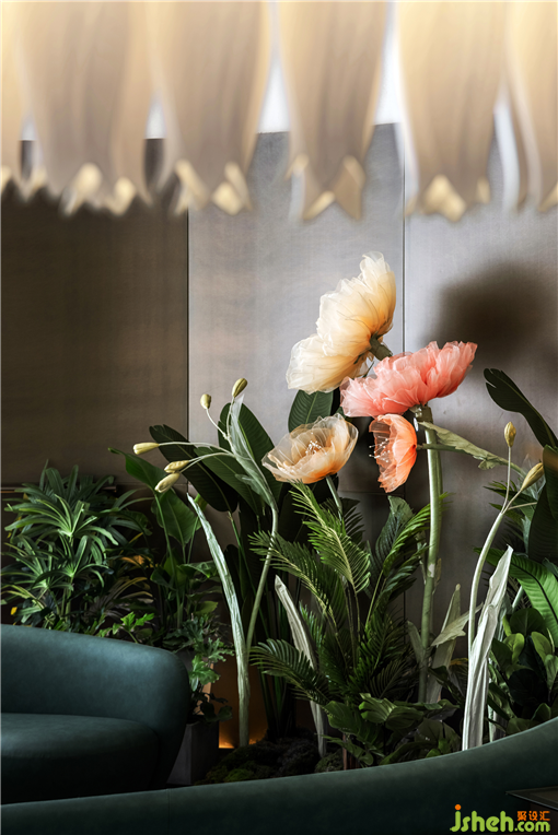 植物藝術(shù)裝置,將自然界隨處可見(jiàn)的苔蘚與花材等復(fù)合材料結(jié)合,售樓中心設(shè)計(jì)將森林山谷中的萬(wàn)物共生的寓意縮影于此,增強(qiáng)空間的生命力與氣場(chǎng)。