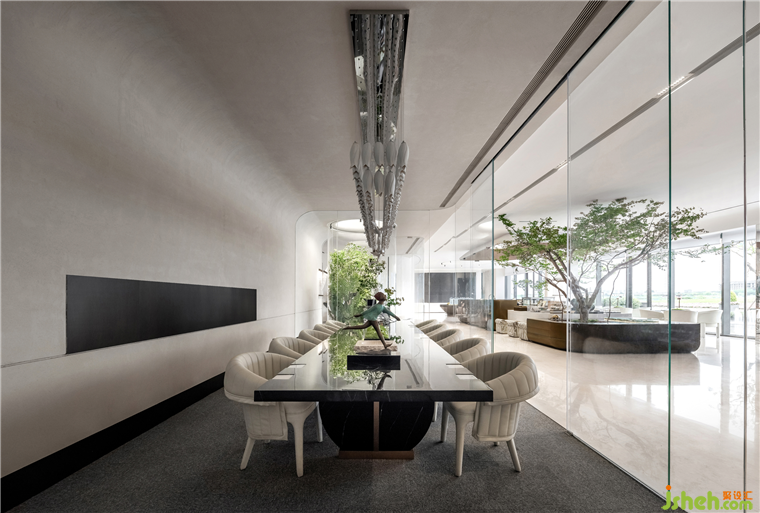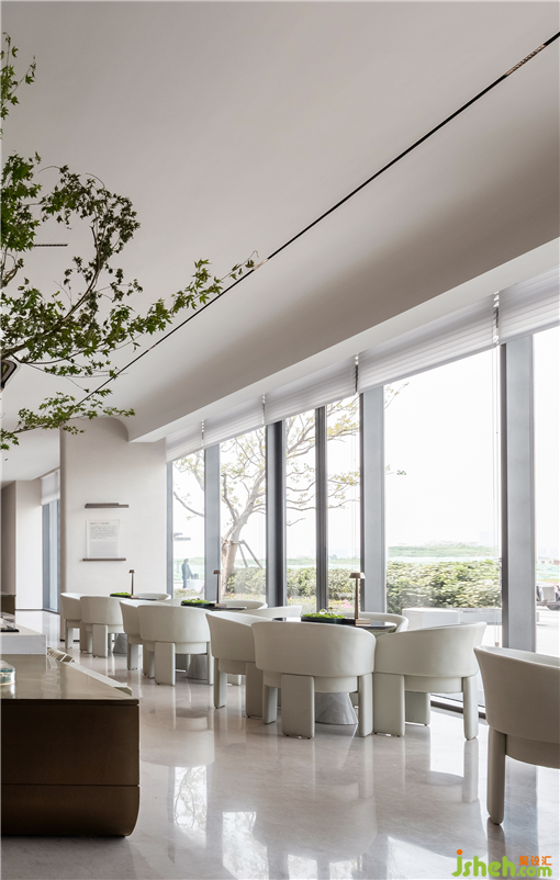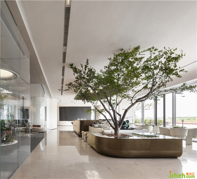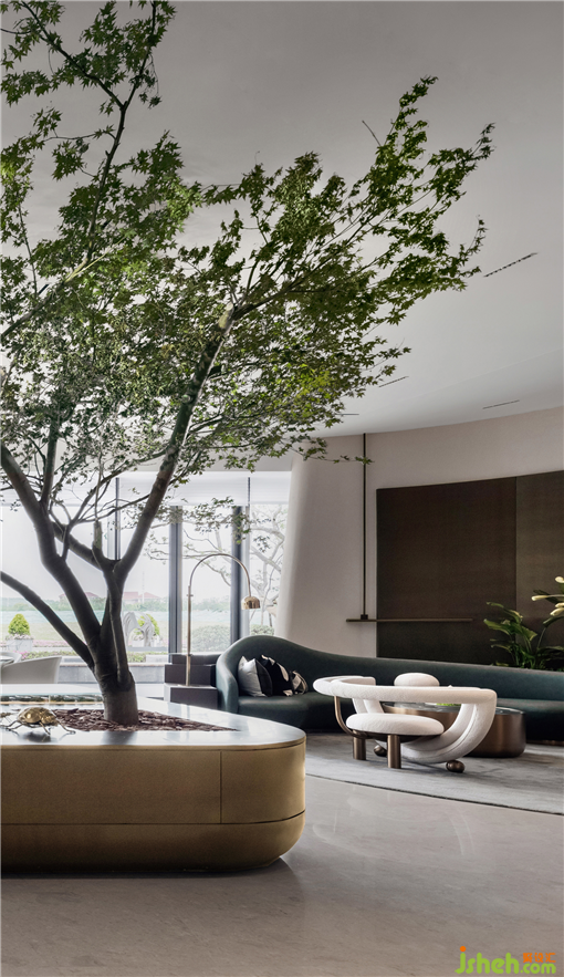一棵綠色的樹(shù)長(zhǎng)在室內(nèi)成為耀眼的存在,它強(qiáng)化了空間以自然為核心的主題,售樓中心設(shè)計(jì)給環(huán)境帶來(lái)了生機(jī)。