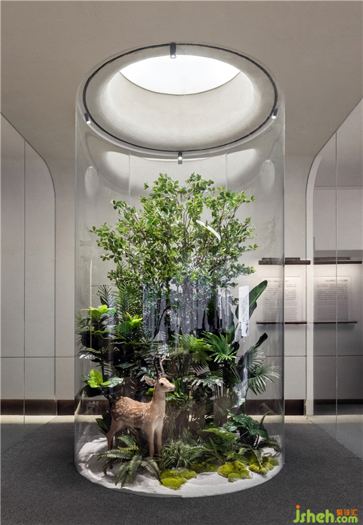 多功能空間與VIP室的過(guò)渡區(qū),添置了一處森林景觀區(qū),我們通過(guò)人為的天光的營(yíng)造把景觀區(qū)作為一個(gè)吸睛的設(shè)計(jì)點(diǎn),售樓中心設(shè)計(jì)將情境主題推到一個(gè)高點(diǎn)。