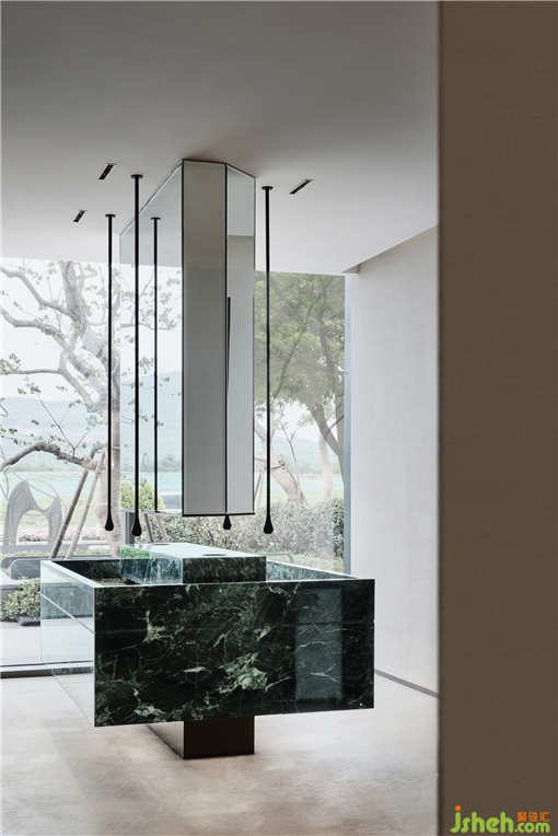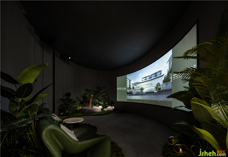 盥洗區(qū)漂浮的綠色洗手臺(tái),懸吊式水滴龍頭,洗手臺(tái)一旁種滿了綠意蔥蔥的植物,售樓中心設(shè)計(jì)任何一個(gè)空間都不忘營(yíng)造自然生態(tài)的體驗(yàn)。
