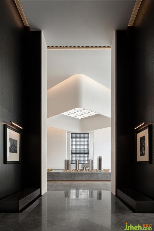 建筑是悠長(zhǎng)蜿蜒的弧形動(dòng)線,室內(nèi)廊道如同一幅靜靜攤開待閱的長(zhǎng)卷。營(yíng)銷中心設(shè)計(jì)師引用經(jīng)典的中軸對(duì)稱,一張一合,一進(jìn)一景的鋪陳手法,去創(chuàng)造高低錯(cuò)落的節(jié)奏和空間序列。