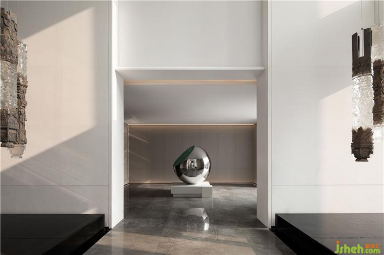 在過廳中,傳統(tǒng)的手工藝以現(xiàn)代化的新材料創(chuàng)意組合,營銷中心設計將磚雕的精工技藝與鉑晶材料結合,呈現(xiàn)了一組彰顯地域歷史特色和現(xiàn)代藝術之美的藝術裝置。