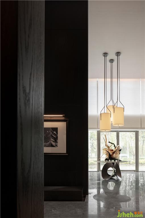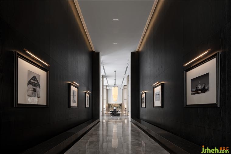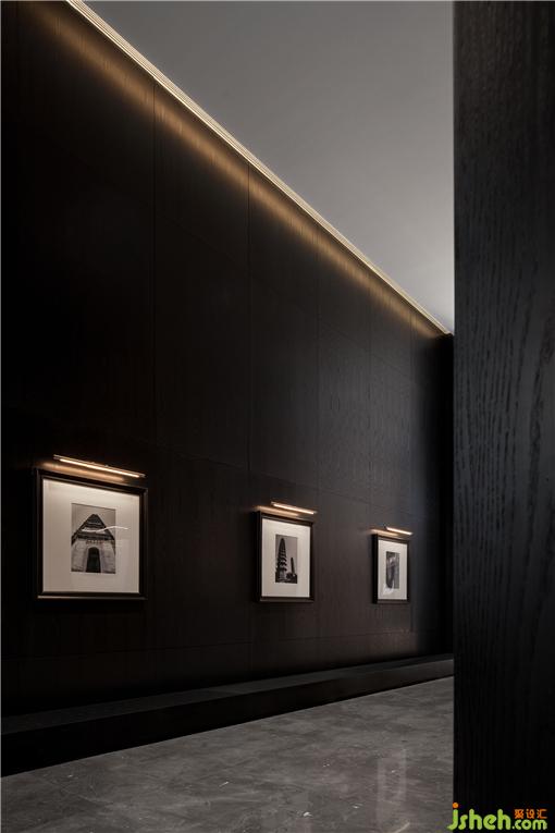 越過沙盤深入中庭,需經過一段悠長的走廊。營銷中心設計師有意在此降低明度,以深色的界面包裹空間,深邃、肅穆……心理感受產生變化。裝點于墻上的黑白古建筑攝影作,增強了室內的藝術內涵與氣息。人們在行進的過程中可一覽太原古城的魅力與豐贍。