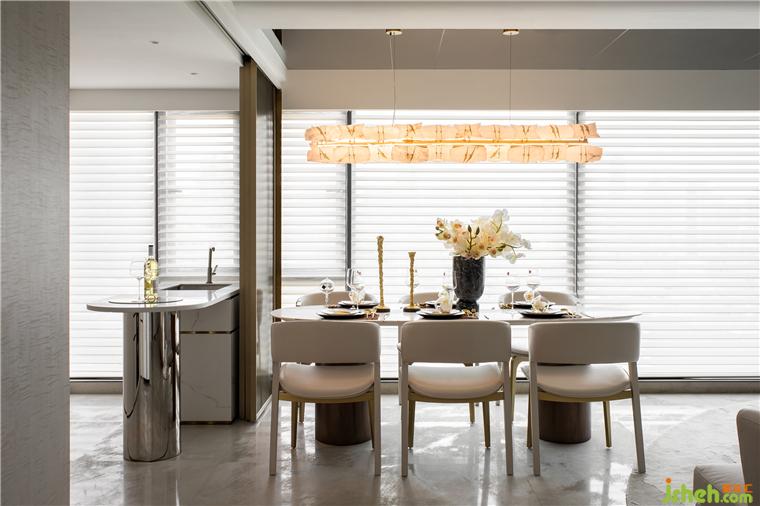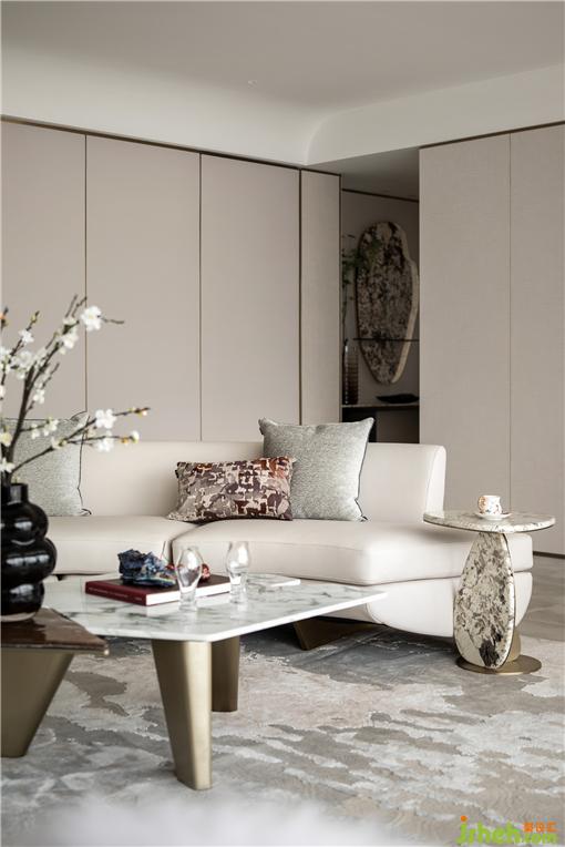 樣板房設(shè)計(jì)簡(jiǎn)潔的空間中大面積運(yùn)用了暖白色系的材料,石材、木飾面、皮革、金屬等,通過細(xì)節(jié)材質(zhì)的變化陳述空間,去表現(xiàn)一種不落俗套的審美意趣。