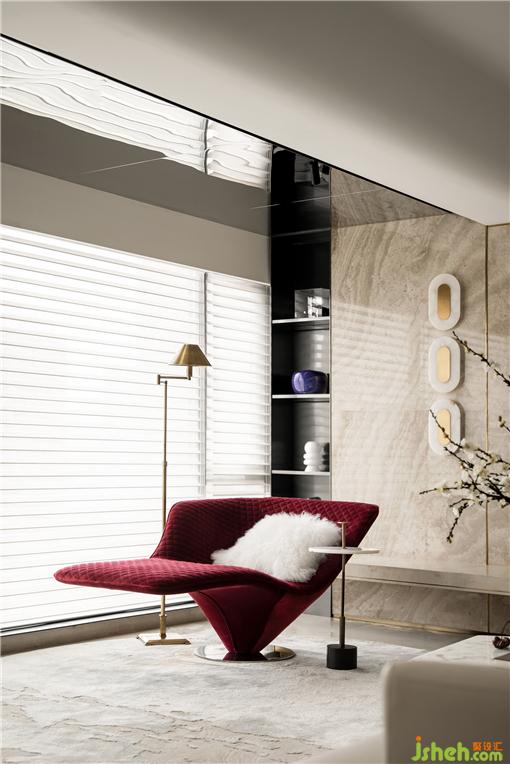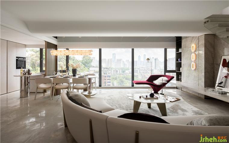 大橫廳全落地窗盡攬室外風(fēng)景。沙發(fā)的造型及擺放方式是靈活且具有趣味感的,配合一張圓形地毯更增添了空間的圓潤度、輕盈感。