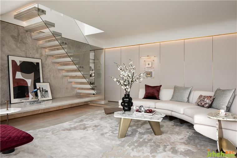 隱形的超白玻欄桿,石材作為踏步,直接展示了梯步的材料和形狀,樣板房設(shè)計(jì)具有輕奢感的樓梯成為空間的立體“雕塑”。