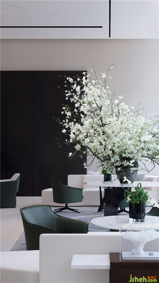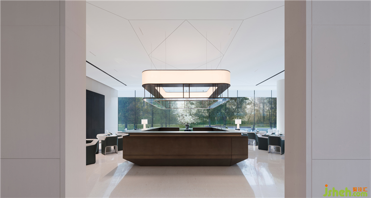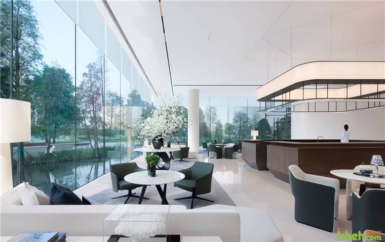 項目原場地未來屬于城市生態(tài)公園,樹木、湖水、陽光,生機(jī)盎然的園林室內(nèi)依托室外景觀帶,順德悅府示范區(qū)設(shè)計以“親水親景”的布局,將內(nèi)在與環(huán)境合為一體,模糊了空間的邊界。