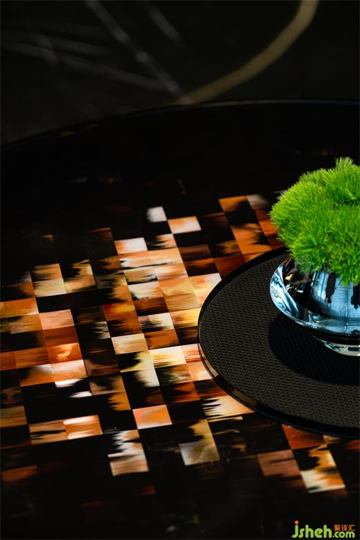 柔和的焦糖色光芒,將藝術(shù)玻璃的朦朧、拼花石材地板的復(fù)古韻味以及古銅與深色木飾面的肌理,準(zhǔn)個凸顯和描繪。