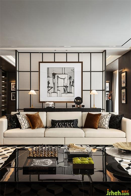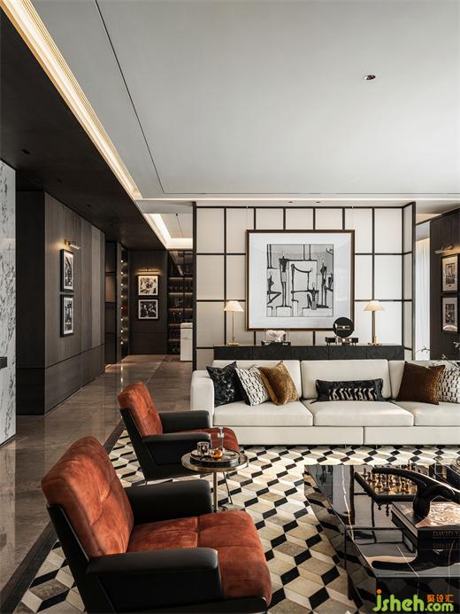 家具選型與陳列方式以專業(yè)會所的形式呈現(xiàn),室內(nèi)的時尚品位、藝術(shù)美學體現(xiàn)在掛畫、燈飾、家具等各類器物的選擇上。