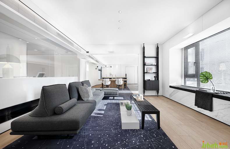 沙發(fā)下是一塊帶有銀河光輝的地毯,一直從客廳延伸到餐廳。坐在沙發(fā)上就好像踏步在璀璨的星河中,大大地滿足了小孩子的好奇心和探索欲。裝修設(shè)計(jì)