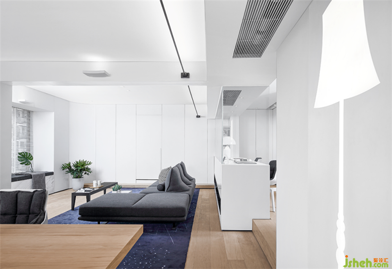 客廳有一處高位, 設(shè)計(jì)師巧妙地在高低位銜接處做了一個(gè)多功能的書桌,小朋友可以坐在上面看書、玩樂高,同時(shí)還能與坐在沙發(fā)上的父母對(duì)視、交流.