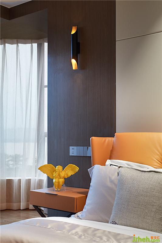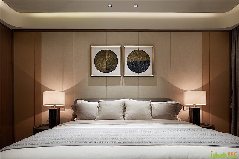 主臥看似和客廳相似,使用的材料卻全然不同??蛷d大部分以石材為主,而主臥則是采用麻布硬包,手感柔軟細膩。設計師通過使用材料不同,強烈對比出兩個功能區(qū)的柔和與剛硬,體現(xiàn)出主臥的那份寧靜與閑適安逸。