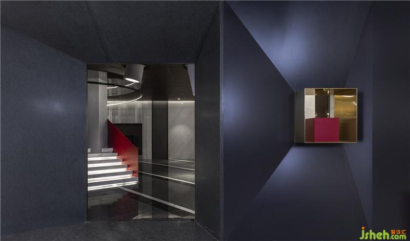 黑、灰的基調(diào)與紅色的熱烈在色彩上以對(duì)比傳遞觸覺(jué)的模擬體驗(yàn);凝練的線條和高度歸納的輪廓刻畫體積,在簡(jiǎn)約中迸發(fā)現(xiàn)代主義的力量;置于空間中部的樓梯借線條凝聚的軌跡營(yíng)造上升感,由實(shí)際形態(tài)的牽引在接受者頭腦中“建立”一個(gè)結(jié)構(gòu),喚醒記憶以模仿某種感覺(jué)。裝修公司