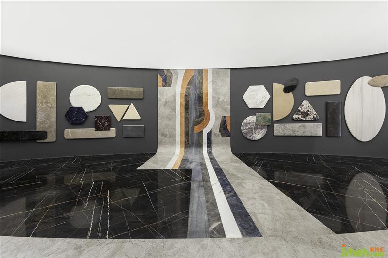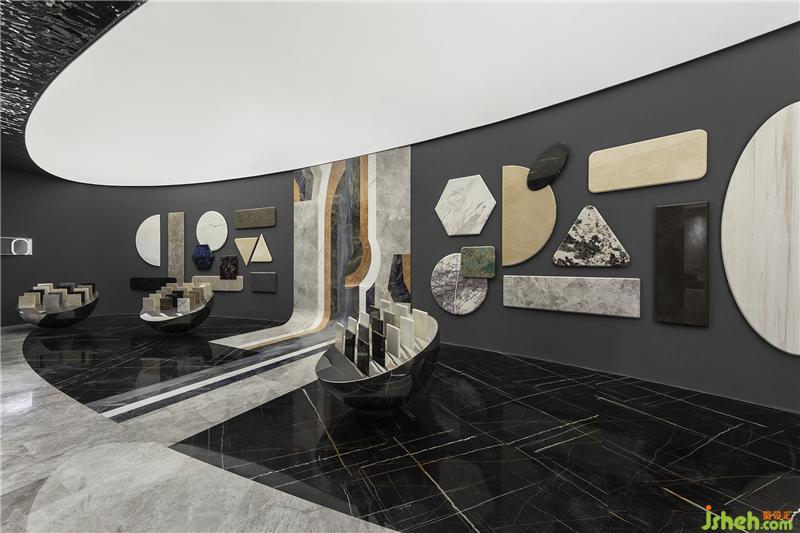 設(shè)計采用了較多的象征性分割,劃分不同功能分區(qū)的同時保持著空間的開闊性。錯落的高差結(jié)合燈光、家具設(shè)置,使領(lǐng)域變得明確;抽象、概括的幾何形界面因此被自然而然地突顯出來。特意打破傳統(tǒng)石材展示標準的石樣尺寸,采用不同形狀且大小迥異的石材錯落分布,營造視覺上的疏密、聚散變化。 展廳設(shè)計