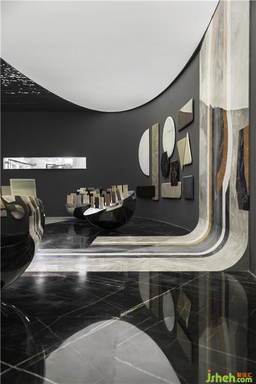 為創(chuàng)作尋找一個靈感點,能夠引導設(shè)計元素的整合。整個石材展廳秉持“以全新視角審視石質(zhì)材質(zhì)之間微妙關(guān)系”的原則,由“太空”的靈感出發(fā)對材質(zhì)、人與空間作了全新解讀。閉目幻想置身于浩渺無垠的太空宇宙中,人的身體在懸浮、運動的巨大星體面前顯得如此渺小。也正是這種懸殊的狀態(tài),才使我們真切地被星體變幻的色彩和微妙的肌理所震撼,體會“材質(zhì)”的張力和沖擊感。設(shè)計的每個細節(jié)都用心營造視覺上的別開生面,形、色、質(zhì)相互作用傳遞出石材的個性。