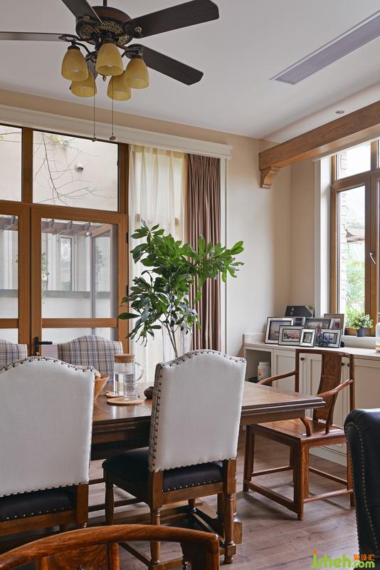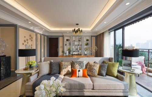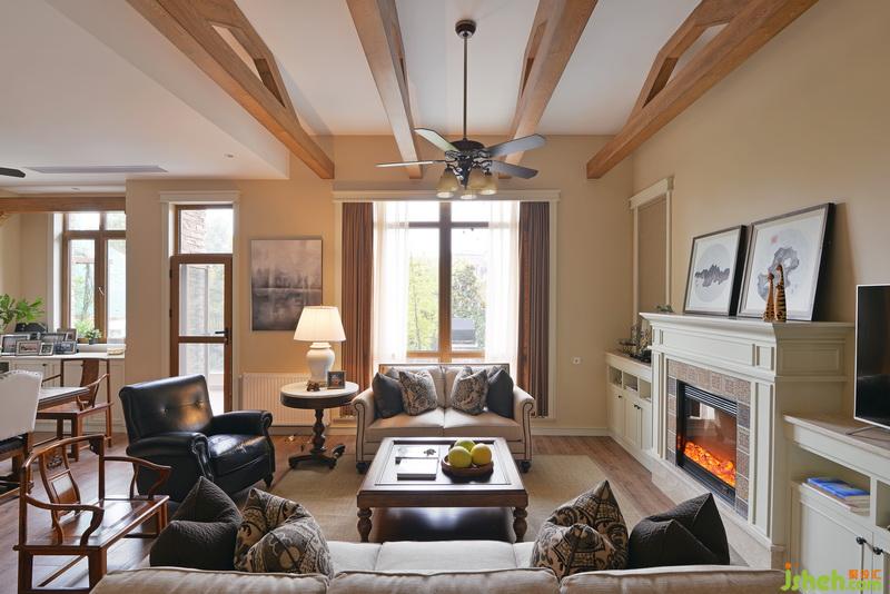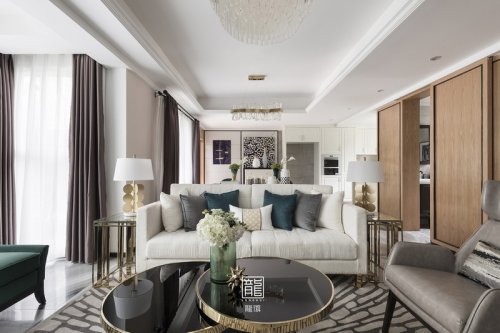 客廳整體室內(nèi)設(shè)計(jì)師以米黃色為基調(diào),搭配咖色與白色木作,自然休閑、溫暖舒適。美式沙發(fā)和中式圈椅的組合,經(jīng)典、和諧,耐人尋味。