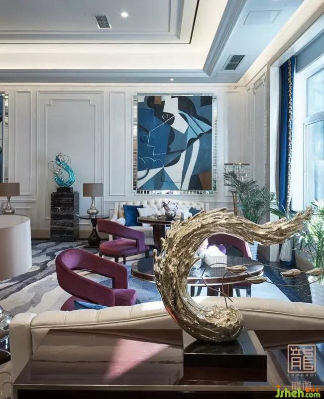 紅藍(lán)色調(diào)的交織,冷暖色調(diào)的交融,既打造出愉悅的視感,又提升了空間的品質(zhì)感。墻上的抽象掛畫里,好似兩位喝著香檳低語談笑的紳士。整個洽談區(qū)空間洋溢著歡悅輕松的氛圍,讓人迷醉其中。