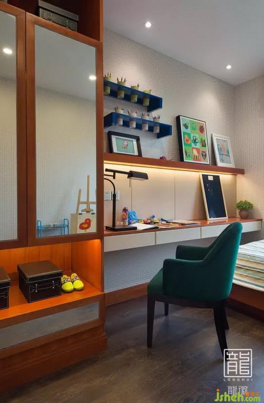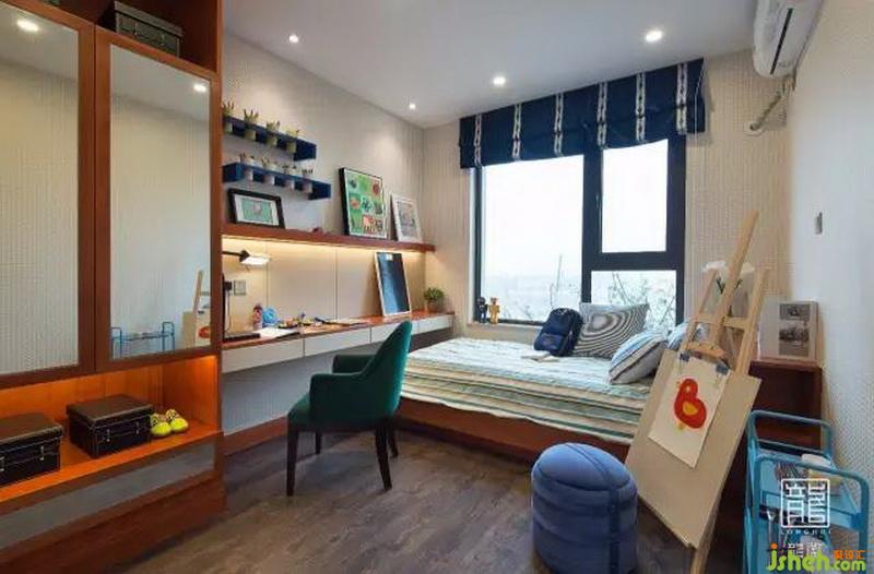 兒童房整體柜的設(shè)計(jì),室內(nèi)設(shè)計(jì)師倡導(dǎo)孩子,快樂學(xué)習(xí),快樂玩耍。翠綠加藍(lán)色的調(diào)性,增加孩子的活潑感??繅Φ拇沧尰顒?dòng)空間更寬闊,繪畫、搭積木、開火車等小朋友最愛的活動(dòng)都能在他的小小天地里得到實(shí)現(xiàn)。